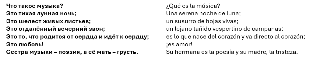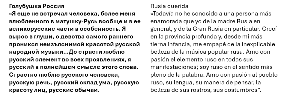 «Уехав из России, я потерял желание сочинять. Лишившись родины, я потерял самого себя…»Al partir de Rusia, perdí el deseo de componer. Al quedarme sin patria, me perdí a mí mismo. Para el exiliado que ha perdido sus raíces musicales, sus tradiciones y su tierra natal, no queda deseo de crear; no le queda otro consuelo que el silencio indestructible de unos recuerdos que nada puede turbar.